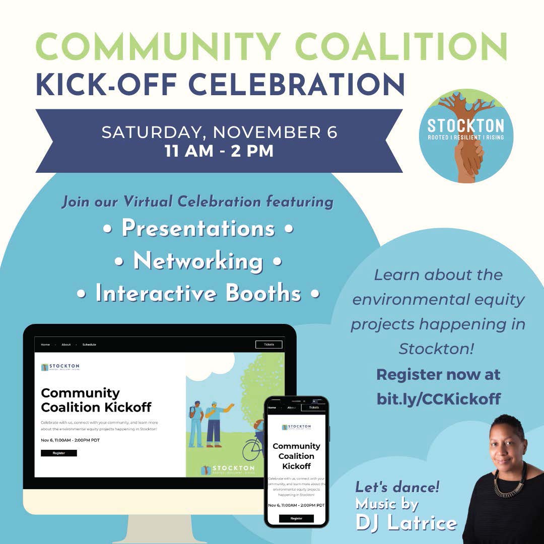 Join us for the Community Coalition Kickoff Celebration, 11 am-2 pm Nov. 6. Learn about environmental equity projects, Stockton Rising (TCC) and San Joaquin Council of Governments’ Stockton Mobility Collective (SMC) project. Come for the presentations, networking and interactive booths. Register for this virtual event: https://bit.ly/CCKickoff.